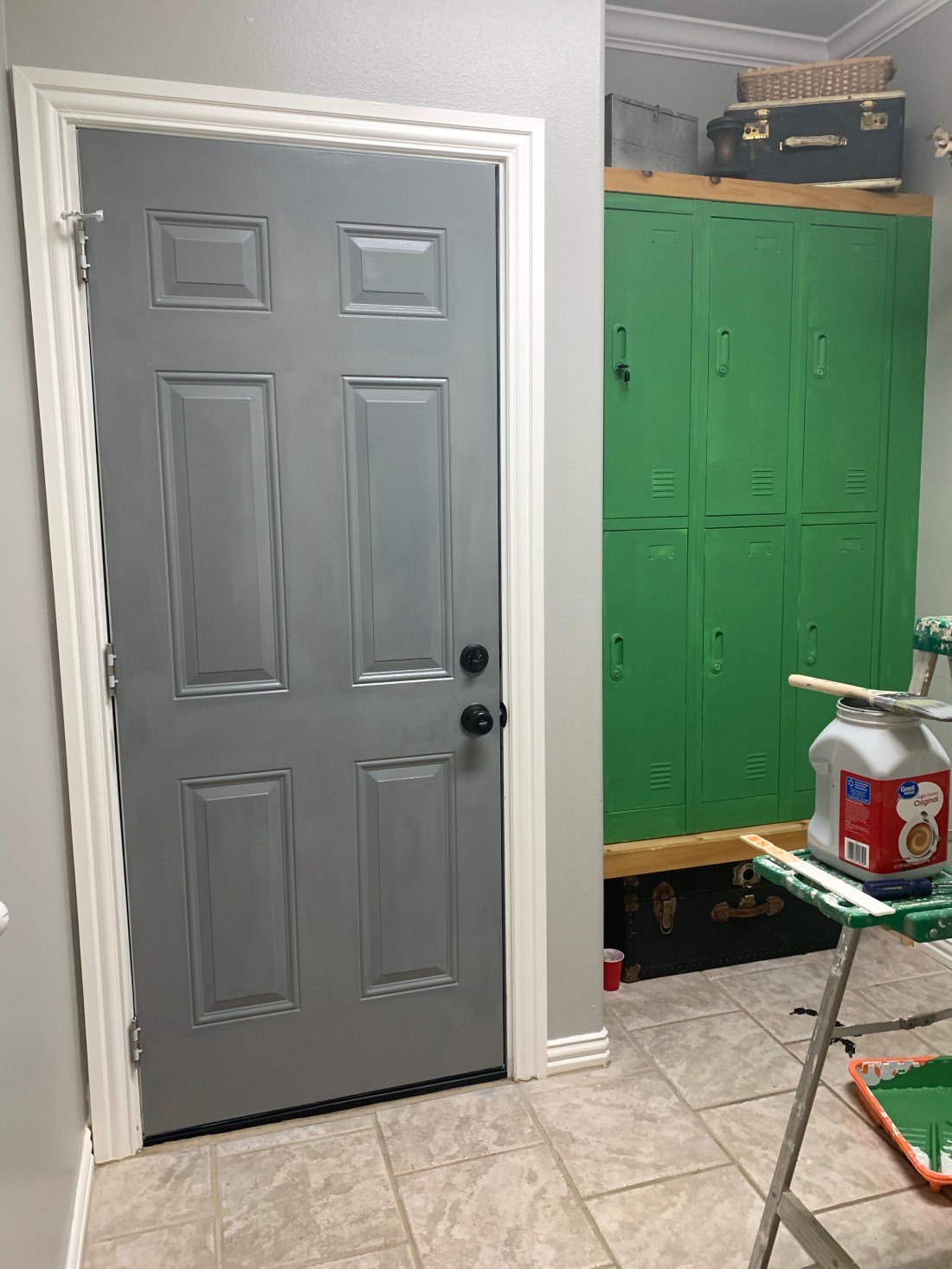 ~ for 90% completion of the DIY project from last week. We had painted the mudroom not long ago with a homemade mix of some leftover paint we had on hand, and we never loved it. And the paint we had used on the mudroom door had never cured. So we gave the room a fresh coat of soft gray paint (replacing the wanna-be-grey-but-actually-more-like-baby-blue color) and the door was first peeled, then primed, then painted navy, then white (in 18 hours) before we finally landed on the right shade of medium warm gray.