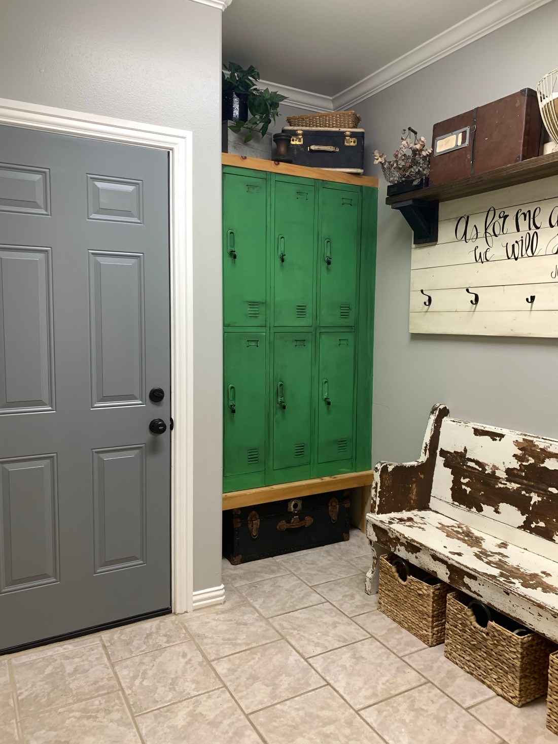 Josh ripped out some non-functional builtins from our mudroom and replaced them with new lockers that I then antiqued to look like a vintage find!