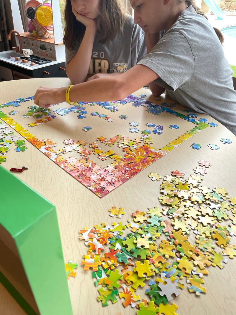 ~ for two fun new puzzles. One down, one well underway. And for stacks and stacks of new paper and art supplies. Aunt Nicki keeps us stocked. Is there anything more fun than a crisp new 64 pack of Crayolas and a sparkling new coloring book?