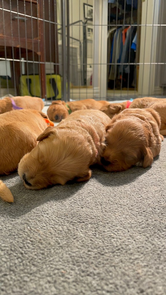 ~ for a successful Week 2 of Operation Bazillion Puppies. We have relocated their enclosure to the master bathroom, so at least now I am back in my bed! (Glory Hallelujah!) The pups and their Mama did well on their first road trip to Carthage for Thanksgiving.
