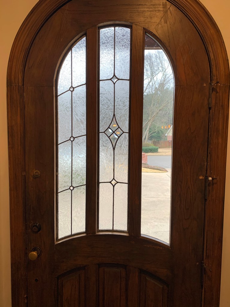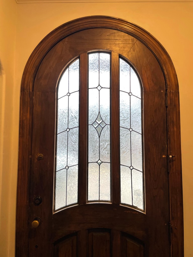 We wanted to change the glass in our front door from the dated leaded-glass panels. We asked a glass installer for an estimate and he said it couldn’t be done. Undeterred, Josh simply decided to do it himself! He carefully removed the trim pieces from each panel, traced the openings to create templates of the glass, and ordered the individual panels from a local glass company.