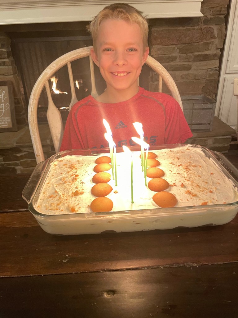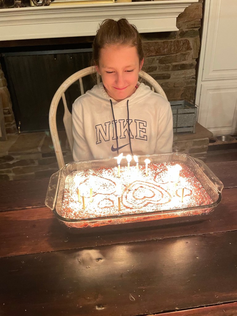 ~ for TWO special birthdays this week. Kora turned 12 and Gavin turned 11. These two are fun to celebrate. Their eyes just sparkle when they feel special. They are eager and grateful recipients, and they both love to bring others into their celebrations. We had made plans to surprise the kids on their Winter Break with a big celebration at the end of Josh’s vacation by actually taking a little mini trip to Dallas for the weekend. But the crazy arctic weather set in, and we had to cancel and come up with a new plan. So we just did our best to have a super-duper fun weekend at home. We started with a movie on Friday at the local movie grille (a first for all the younger kids) followed by cocoa by the fire. Saturday was Kora’s cinnamon roll birthday breakfast, birthday lunch, arts and crafts, sliding on ice, seafood restaurant for dinner, and homemade fudge brownies à la mode. And then “Gavin-tine’s Day” began with sausage, eggs, and heart-shaped chocolate chip pancakes for brunch, build-your-own pizzas + macaroni and cheese (from the box) + salad and banana pudding for dinner, and we finished the double-decker-vacation/birthday-celebration marathon by BRIEFLY frolicking in the FREEZING snow flurries before bed.