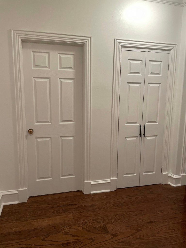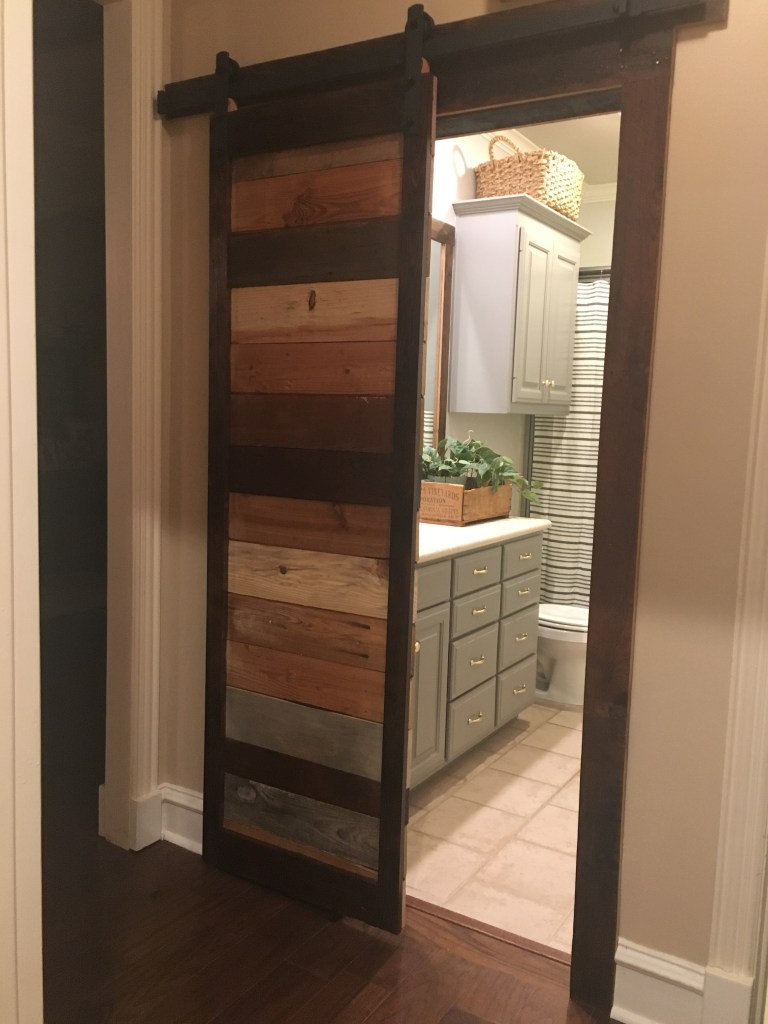 Our first stage of remodeling was to cut a doorway in the hallway and Josh built/installed a custom reclaimed wood barn door. We painted the walls and cabinets and framed out the wall mirror at that time as well.