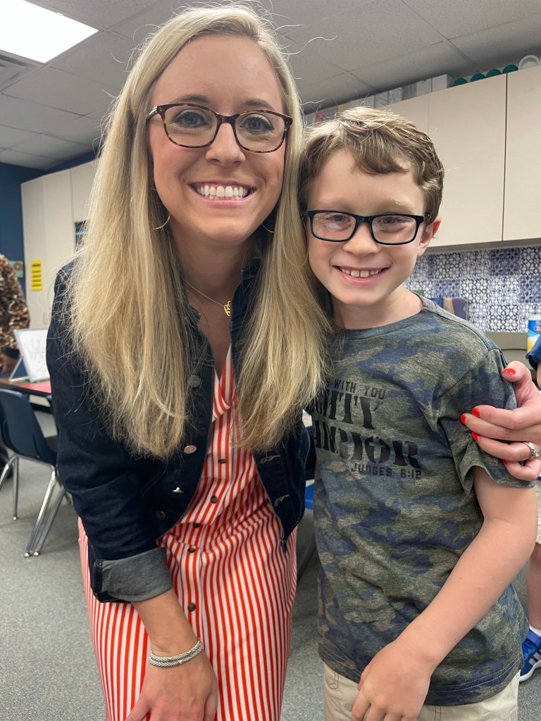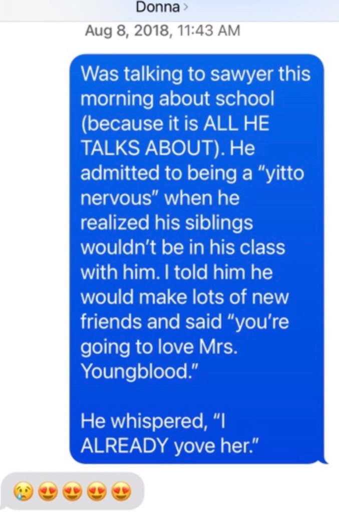 Talk about a heart-exploding display of God’s miraculous works! We all looked forward to and planned the day that Miss TK would be in her class. In fact, I deliberately made the decision to keep Tatum K home this year AFTER checking with Donna to make sure she wasn’t retiring. TK and I always visited Mrs. Youngblood when we were at the school for a hug and a smile. We exchanged hugs and encouragements last Friday morning.