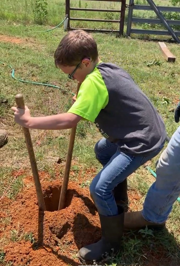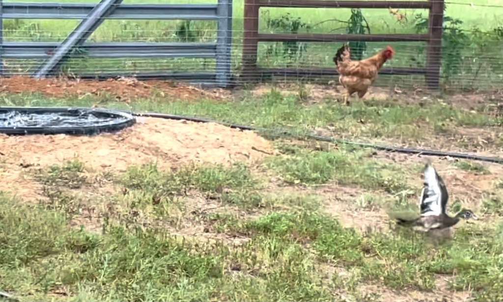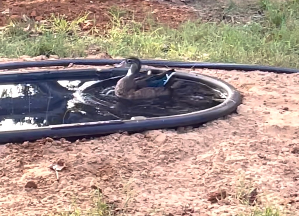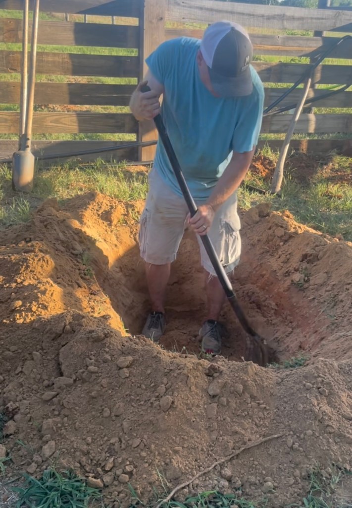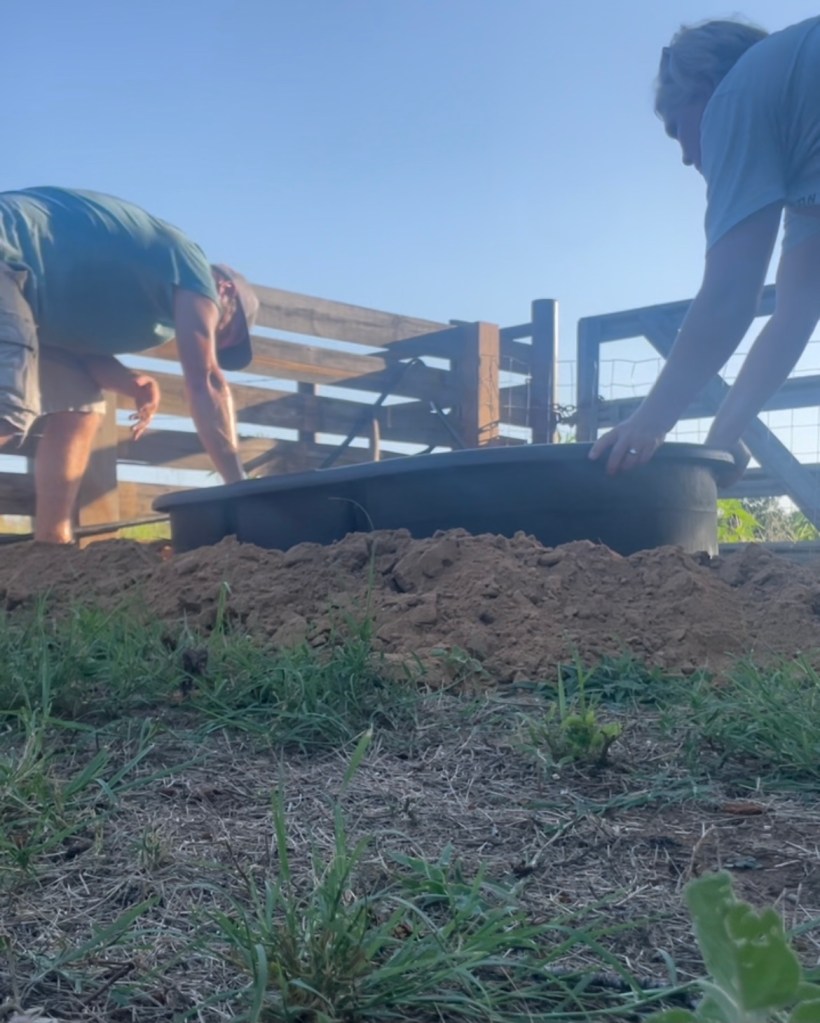 Among the countless trash and treasure items left on the property by the previous owners was a large stock tank. Josh spent over an hour digging down roughly 4 feet through about a bazillion layers of rock solid Texas clay. In the 102° blazing heat. For a single duck who hates the water. Because he thinks he’s a chicken.