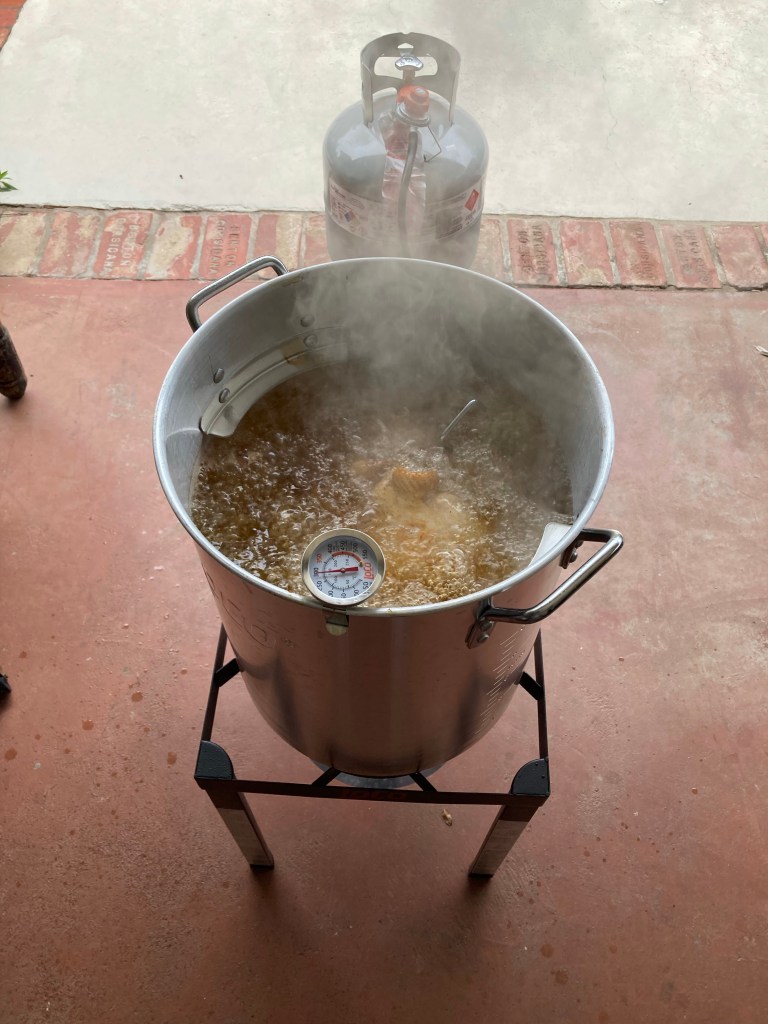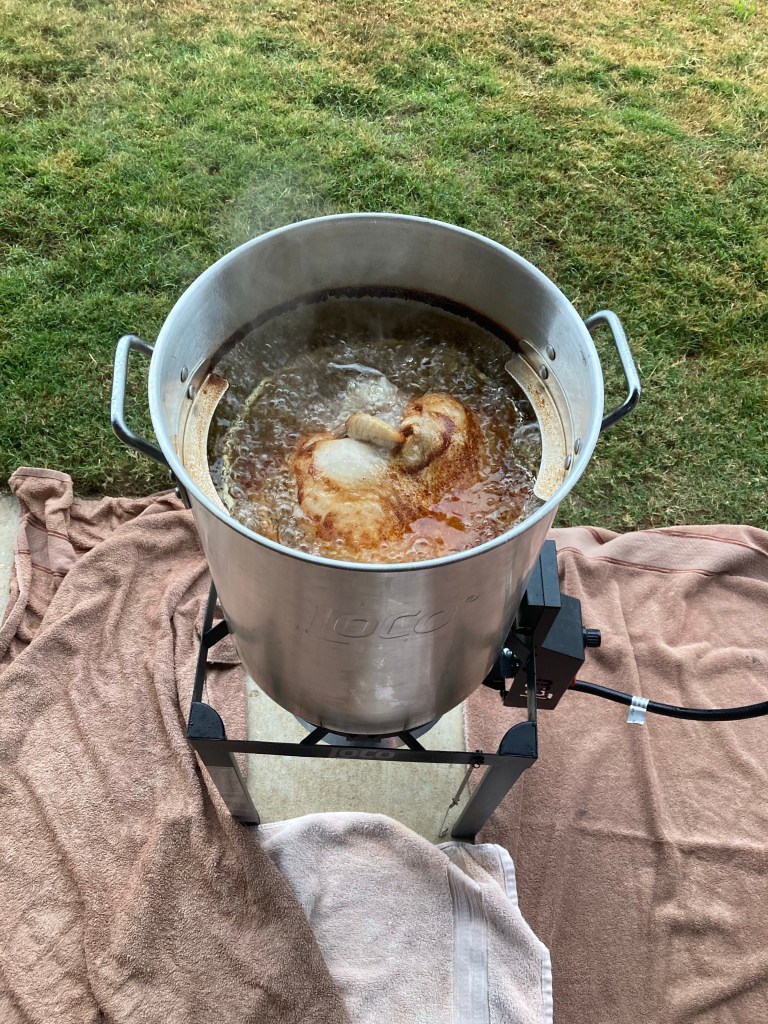 ~ for a successful, if INTENSELY STRESSFUL, first attempt deep frying a turkey. We have heard so many horror stories of fires and explosions, so we had the fire extinguisher at the ready. After a multiple generous injections of creole butter, and a 50 minute bath in boiling peanut oil, we had a gloriously golden brown, crispy skinned bird! It was delicious!
