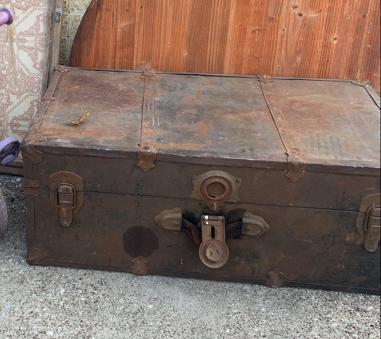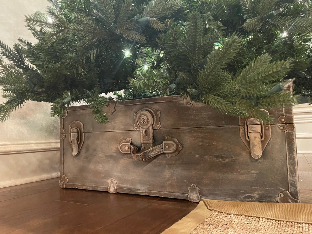 ~ for the start of our holiday decorating. It’s so exciting to pull out the tubs and bags and get out all the Christmas greenery and sparkles. I did a quick little upcycle with two trash finds today. I cut off the top of a rusted old steamer trunk and dry brushed it with some white paint for a “new” tree base.