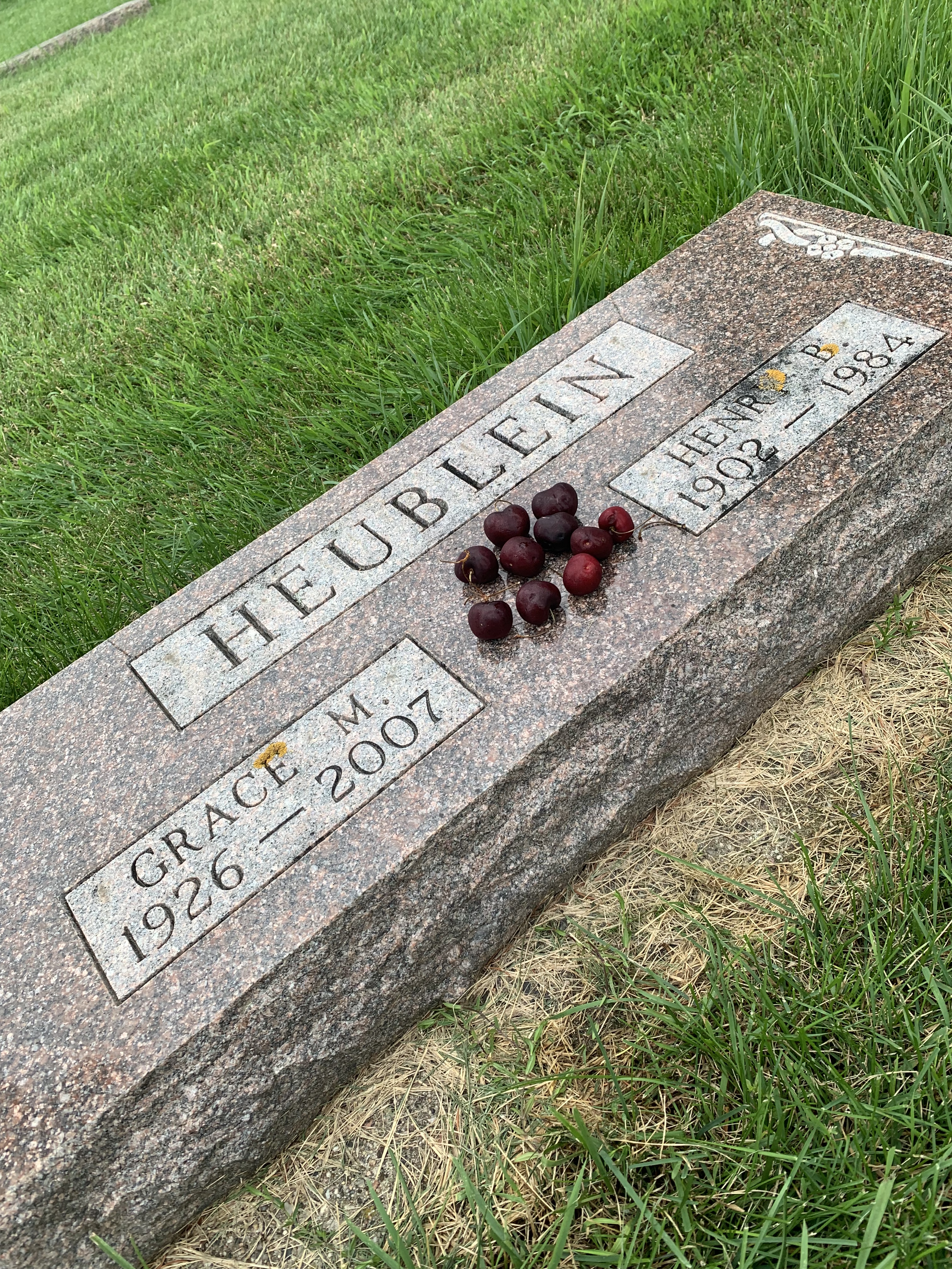 stop at gravesite of my Grandpa Henry and Grandma Grace, where I left cherries for the birds like I used to when I was a little girl.