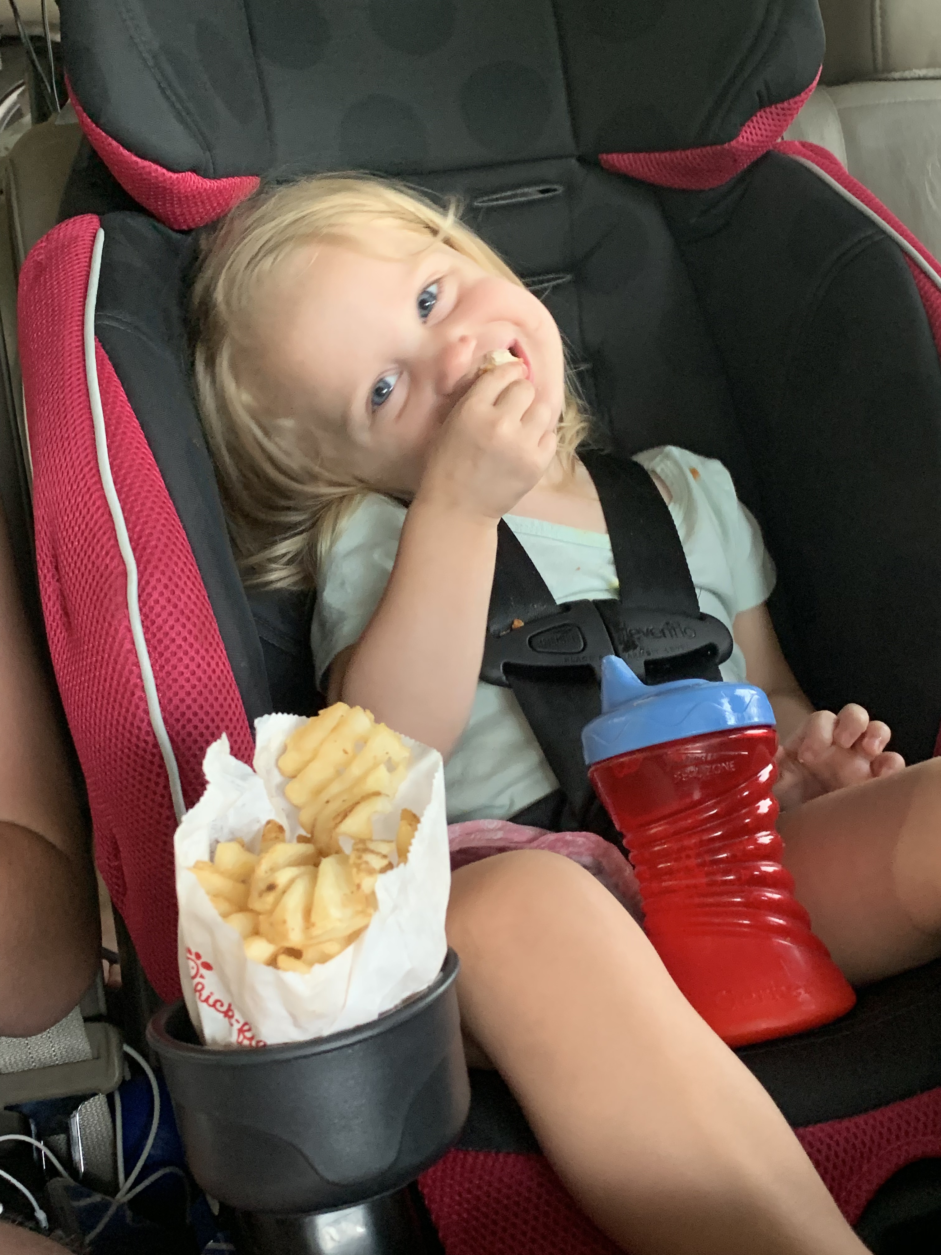 ~ for Chick-Fil-A!!! Oh how we missed you! We hit Sulphur Springs on the way home just in time for dinner, and the car erupted in cheers when we pulled up! Tatum K was SO DONE with the car at that point, but she perked up for chicken and french fries!